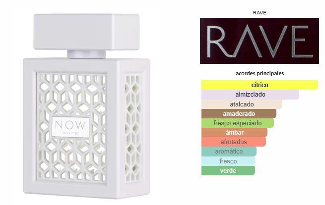 | RAVE Now White – Eau de Parfum 100 ml (Unisex)Frescura limpia con un fondo cálido y elegante. ¿A qué huele?Empieza con una explosión cítrica chispeante, se transforma en un corazón afrutado y limpio, y termina en una base cálida y reconfortante. Notas olfativas:![]()