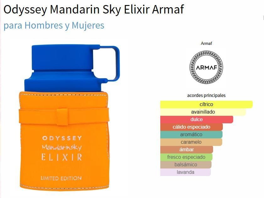 | Content | Odyssey Mandarin Sky Elixir de Armaf – Eau de Parfum 100 ml Unisex Descubre la nueva joya olfativa de Armaf, una fragancia Oriental Amaderada diseñada para hombres y mujeres que buscan elegancia, energía y un toque de misterio. Odyssey Mandarin Sky Elixir (2025) se abre con una explosión cítrica vibrante de mandarina y naranja, suavizada por notas de lavanda, pimienta negra y cardamomo que aportan sofisticación. Su corazón revela una mezcla seductora de caramelo, haba tonka, pachulí e incienso, envolviendo los sentidos en calidez y profundidad. Finalmente, su fondo de vainilla y vetiver deja una estela cremosa, elegante y duradera. Familia olfativa: Oriental Amaderada Ideal para: cualquier momento del día o de la noche, cuando quieras destacar con un aroma moderno, dulce y envolvente. | Muestras de Perfumes Árabes – Elige tu Favorito (7 Opciones)Incluye atomizador premium recargable de 5 ml Descubre los perfumes árabes más famosos y deseados del momento. Elige la muestra que prefieras y recíbela junto a un frasco atomizador de 5 ml, elegante, recargable y perfecto para llevar en el bolsillo o bolso. ¿Qué incluye cada muestra?1 muestra del perfume elegido Opciones disponibles (7 fragancias árabes icónicas):Khamrah de LattafaDulce, especiado y adictivo. Toques de vainilla, canela y ámbar. Uno de los más virales. Yara TousDulce, cremoso y femenino. Ideal para quienes aman aromas suaves y bonitos. Yara RosaFloral elegante con un toque moderno. Femenino, delicado y encantador. Yara CandyDulce tipo golosina, juvenil y divertido. Perfecto para quienes disfrutan aromas gourmand. Asad ZanzibarAromático, tropical y masculino. Una fragancia fresca con presencia. Badee Al Oud AmethystElegante, floral y oriental. Con notas intensas y larga duración. Badee Al Oud Noble BlushDulce, floral y sofisticado. Ideal para quienes buscan un aroma femenino y duradero. Llévalo donde quierasEl atomizador de 5 ml incluido es: Podrás tener tu fragancia favorita siempre contigo sin cargar con el frasco grande. Ideal para:Probar antes de comprar el frasco grande | Perfume Unisex Noor de Riiffs – Edición 2025 Déjate envolver por una fragancia irresistible y adictiva que se ha convertido en uno de los grandes éxitos de ventas del momento. Notas olfativas: