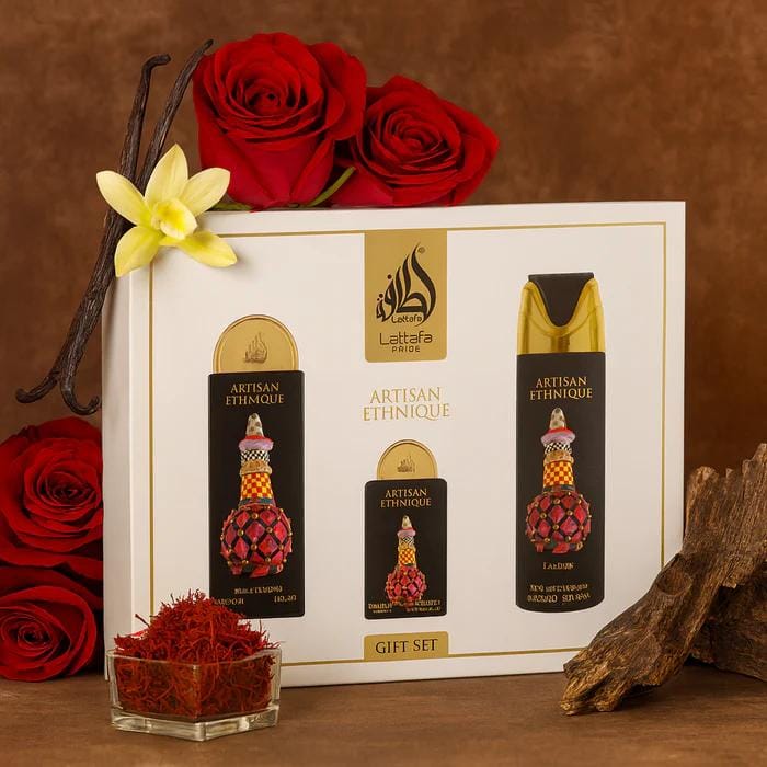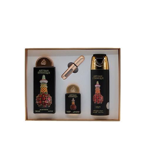 | Content | Pack Lattafa Pride Artisan Ethnique Giftset (4 uds.)Exclusividad, elegancia y sofisticación en un solo estuche. Descubre el lujo árabe con este set de regalo premium Lattafa Pride Artisan Ethnique, una edición pensada para quienes valoran la distinción y el arte en la perfumería. Un pack completo que combina intensidad, frescura y versatilidad para acompañarte en cualquier ocasión. Contenido del Pack: