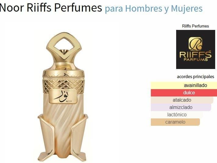 Noor de Riiffs Perfumes pertenece a la familia olfativa Oriental Vainilla, ideal tanto para hombres como mujeres que buscan un aroma dulce, elegante y sofisticado.