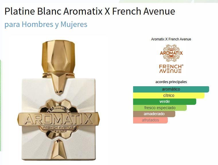 | Content | ✨ Fragancia Floral Unisex ✨ Descubre Platine Blanc, la nueva creación de Aromatix junto a French Avenue. Una fragancia fresca, elegante y moderna, diseñada para hombres y mujeres que buscan un aroma limpio pero con personalidad. Ideal para uso diario o ocasiones especiales. Notas de Apertura