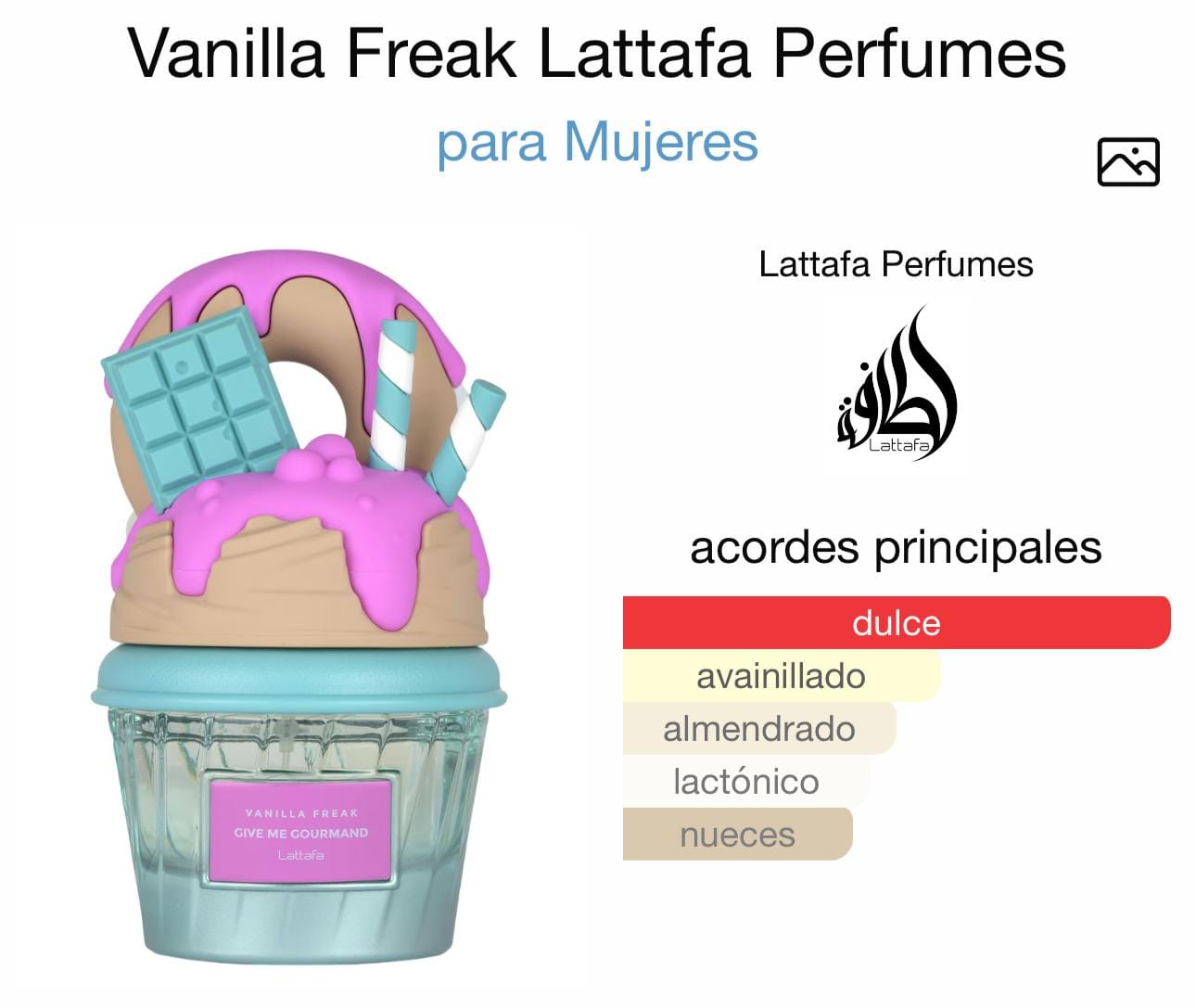 | Content | Vanilla Freak by Lattafa Perfumes (EDP 100ml) Descripción: Atrévete a ser la más dulce con Vanilla Freak, la nueva joya de Lattafa Perfumes (2025). Una fragancia Oriental Vainilla creada para mujeres que aman los aromas cálidos, golosos y adictivos. Su mezcla deliciosa de vainilla, canela y azúcar glaseado convierte cada rociada en una auténtica fantasía olfativa. Notas olfativas: Salida: Quequito (pastelito) — una apertura suave y esponjosa que conquista al instante. Corazón: Almendra, azúcar, azúcar glaseado y canela — una combinación que huele a repostería recién horneada. Fondo: Vainilla, mantequilla y almizcle — un final cremoso, cálido y adictivo. Sensación: Un perfume que te hace sentir como si caminaras envuelta en una nube de dulzura. Gourmand, sensual y reconfortante, perfecto para quienes aman destacar con un toque elegante y femenino. Ideal para: Días fríos, noches especiales o cuando quieras dejar una huella deliciosa. Una fragancia imposible de olvidar. Formato: Eau de Parfum 100 ml Fragancia femenina ️ Lanzamiento: 2025 | Whipped Pleasure – Lattafa Perfumes (2025) Déjate envolver por la nueva joya olfativa de Lattafa Perfumes: Whipped Pleasure, una fragancia femenina de la familia Oriental Vainilla, creada por la nariz Nisrine Bouazzaoui Grillié. Un perfume sensual, adictivo y sorprendente que hará que todos giren la cabeza cuando pases. Pirámide Olfativa